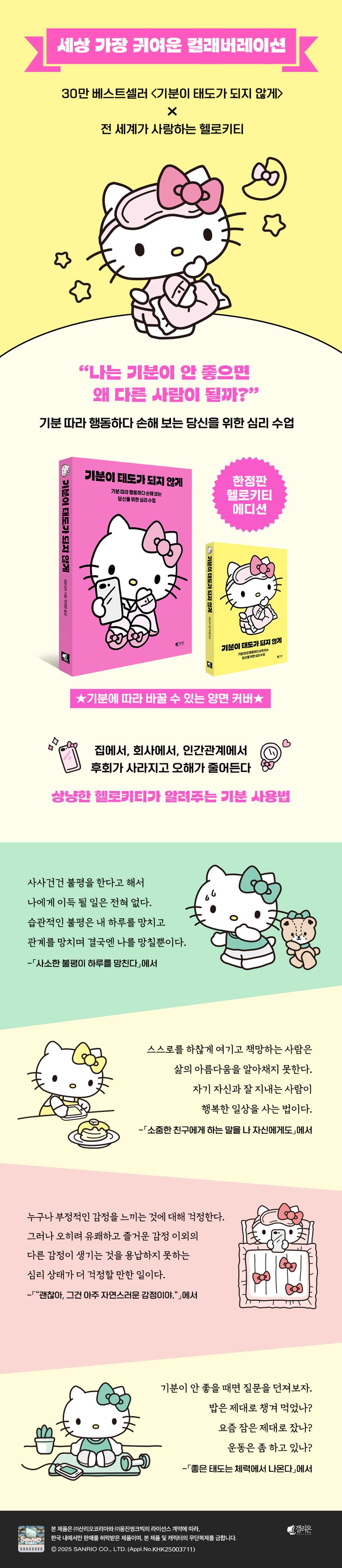 30만 베스트셀러 『기분이 태도가 되지 않게』와 세상에서 가장 귀여운 ‘헬로키티’가 만났다. 전 세계 다양한 세대에게 꾸준히 사랑받은 헬로키티는 국내외 여러 유명 브랜드와 컬래버레이션을 진행했다. 이번에는 2020년 출간 이후 독자들에게 꾸준히 사랑받아온 『기분이 태도가 되지 않게』와 함께한다.