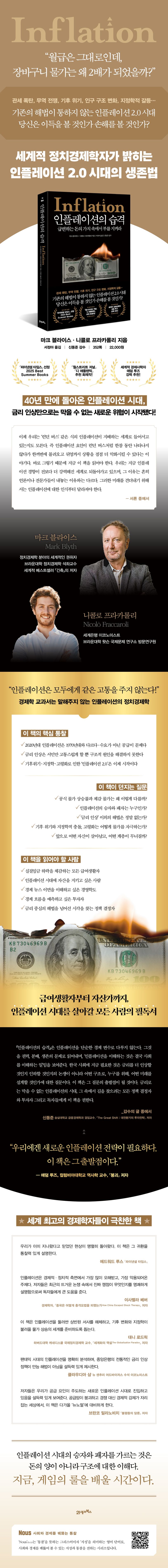 이 책은 인플레이션을 둘러싼 통념을 뒤집고, 우리가 살아갈 새로운 경제 환경을 준비하도록 돕는다. 세계적 석학들이 찬사를 보낸 이 도발적이고 설득력 있는 경제서는 불확실한 시대를 헤쳐나갈 필수 지침서가 될 것이다. 애덤 투즈의 말 그대로다. “우리에겐 새로운 인플레이션 전략이 필요하다. 이 책은 그 출발점이다.”