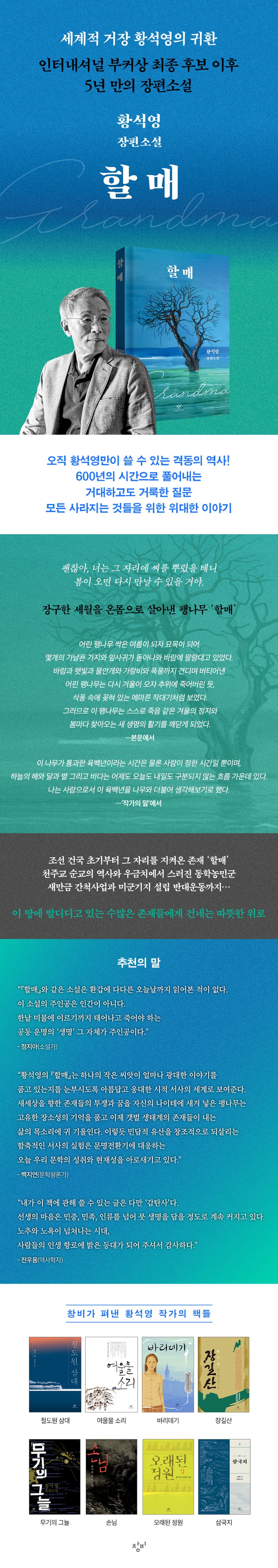 한국문학의 가장 높은 산, 만해문학상·대산문학상·에밀 기메 아시아문학상 수상에 빛나는 황석영이 장편소설 『할매』로 돌아왔다. 인터내셔널 부커상 최종후보에 오르며 전세계를 열광시킨 『철도원 삼대』(창비 2020) 이후 5년 만의 신작이다. 저자는 한국 근현대 노동자의 삶을 묵직한 서사로 꿰뚫었던 전작에 이어 이번에는 장구한 역사와 인간 너머의 생명으로 이야기의 지평을 한층 넓혔다. 지구적 생명을 감싸안는 황석영 문학의 새로운 경지라 이를 만하다. 이 소설은 한마리 새의 죽음에서 싹터 600년의 세월을 겪어온 팽나무 ‘할매’를 중심축으로 이 땅의 아픈 역사와 민중의 삶을 장대하게 엮어낸다. 인간과 자연, 삶과 죽음이 별개일 수 없으며 모든 존재가 거대한 인연의 그물망 속에서 순환한다는 웅숭깊은 깨달음을 전하며 기후 위기와 생태 파괴의 시대를 살아가는 우리에게 묵직하고도 아름답게 존재의 근원에 대해 질문한다. 또한 황석영 특유의 힘 있는 필치와 압도적인 서사는 읽는 이를 단숨에 시공을 가로질러 생생하게 살아 숨 쉬는 격동의 역사 현장으로 데려다놓는다. 한반도의 비극적 역사뿐만 아니라, 이름 없는 풀벌레의 날갯짓부터 갯벌의 숨소리까지 소설이 포착할 수 있는 세계가 이토록 넓을 수 있음을 확인할 수 있다.