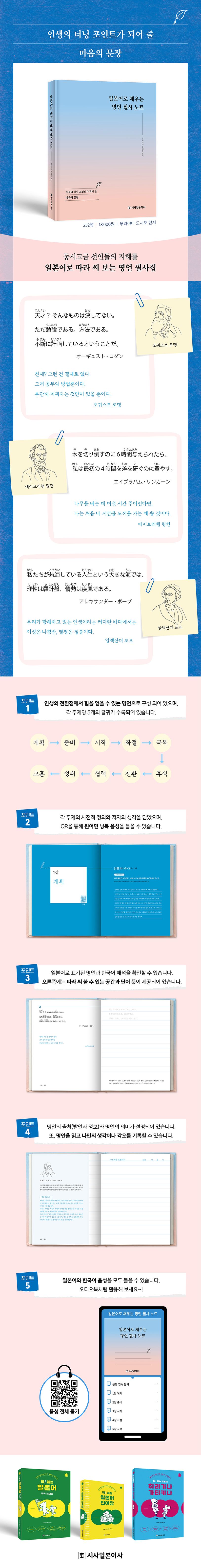 이 책은 인생의 터닝 포인트에서 힘을 얻을 수 있는 글귀들로 구성된 일본어 필사 노트입니다. 시대나 국적을 뛰어넘어 계속해서 회자되는 보물과 같은 선인의 명언을 주제별로 수록했습니다. 각각의 명언에는 해설과 단어 뜻이 제시되어 있습니다. 동일한 말을 일본어와 한국어로 어떻게 표현하는지 그 차이를 알게 되는 것도 본 교재를 통해 얻을 수 있는 또 하나의 학습 효과입니다. 하루에 한 문장씩 필사하며 그 내용을 깊이 음미해 보시기를 바랍니다.