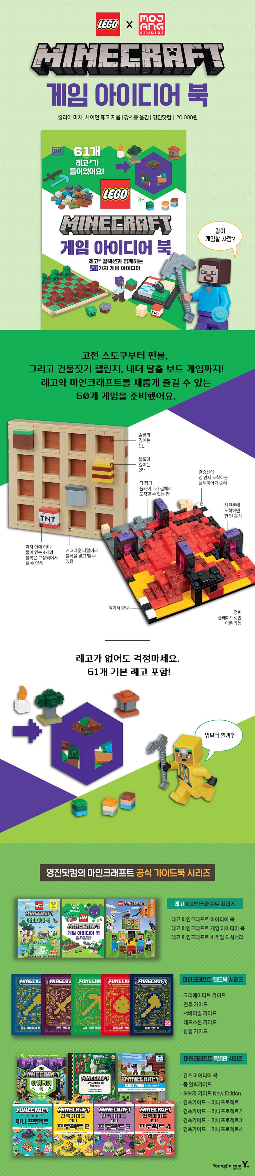 『레고 마인크래프트 게임 아이디어 북』은 마인크래프트를 좋아하는 사람들이 직접 만들고 즐길 수 있는 50가지 게임 아이디어가 가득한 책이에요. 스도쿠, 다른 그림 찾기, 볼링, 네더 수레 경주……. 마인크래프트 테마로 변신한 각종 게임들은 레고만 있으면 내 방에서 바로 플레이할 수 있어요. 책을 펼치는 것만으로도 마크 세계가 눈앞에서 살아나는 느낌!