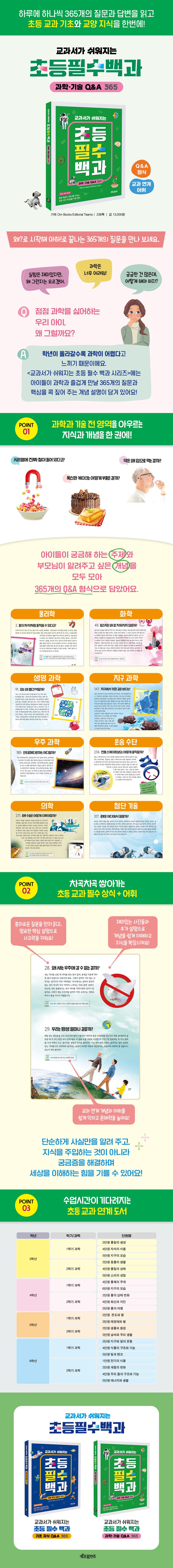 《교과서가 쉬워지는 초등 필수 백과 과학·기술 Q&A 365》를 펼쳐 보세요. 이미 알고 있다고 생각한 것은 정확하게, 어디선가 들어 본 적 있는 것은 확실하게, 처음 알게 된 것은 흥미롭게 배우며, 과학의 전 분야와 관련 기술에 대해 재미있게 알게 될 거예요.