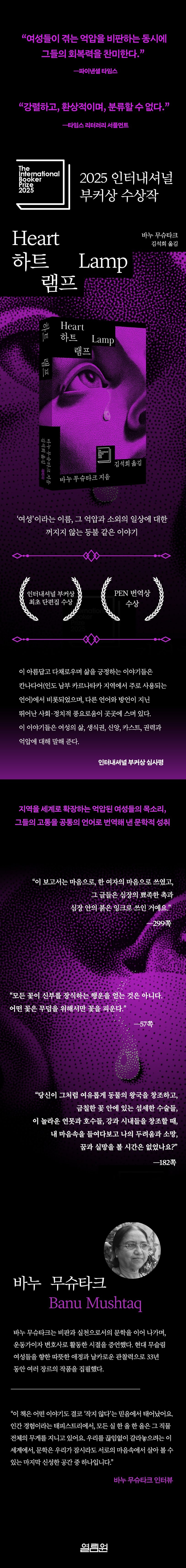 『하트 램프』는 인터내셔널 부커상 최초 단편집 수상작이다. 바누 무슈타크가 기록한 인도 여성들의 초상은 가족 및 지역 사회의 갈등을 연민 어린 애정과 냉소적인 유머로 풀어낸 데에 찬사를 받았다. 『하트 램프』의 주요 무대는 남인도의 가부장적 이슬람 문화권이다. 열두 편의 이야기에서 작가는 변방에서 고통받는 여성들의 일상을 풍부한 구어체로 정교하게 포착하며, 인물들의 따뜻한 마음과 작가의 어두운 유머 간 대비에서 우러나는 감정적 깊이를 느끼게 해 준다. 특히 그가 묘사한 할머니-엄마-딸의 관계는 여성으로 살아감에 따라 짊어져야 하는 삶의 무게와 긴밀해지는 연대, 굳건한 내면의 힘, 생존과 저항을 통해 조용하지만 강하게 독자를 매료시킨다. 무슈타크는 핍진한 구어체에서 깊은 감정을 길어 내는 놀라운 작가이자 인물의 마음을 관찰하는 연구자이다. 극적인 플롯보다 일상적 나날을 따라가며 사회적인 맥락 속 섬세한 감정선을 포착했을 뿐 아니라, 재치 있고 풍자적인 특유의 문체는 이야기 전반에 아이러니한 긴장감을 불어넣는다. 그의 작품은 인도에서 가장 권위 있는 문학상과 보수적인 지역들의 비난을 동시에 받았다. 『하트 램프』의 부커상 수상은 인도의 저항문학적 전통이 단지 지역 담론에 머무르지 않고, 문화적 구체성이 세계 문학의 보편적 메시지로 확장될 수 있음을 보여 주며, 현시대 새로운 고전이 될 것을 예견한다.