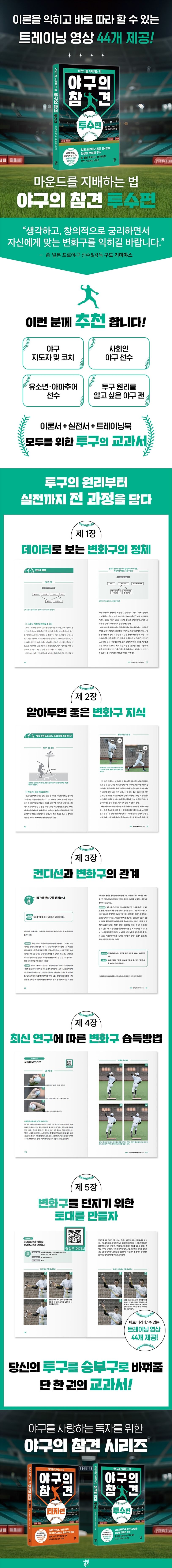 이 책에서는 실전에서 필요한 커브, 슬라이더, 커터, 포크, 스플리터, 체인지업 등 각 변화구를 단계적으로 익히는 방법을 소개한다. 처음 배우는 변화구부터 고속 변화구까지, 손가락 감각과 회전 느낌을 익히기 위한 구체적인 연습법을 제시한다. 이를 통해 투구의 이해를 돕는다. 전완, 어깨, 견갑골을 중심으로 한 기초 운동과 스트레칭, 케어 방법까지 투구의 전 과정을 체계적으로 다룬다.
