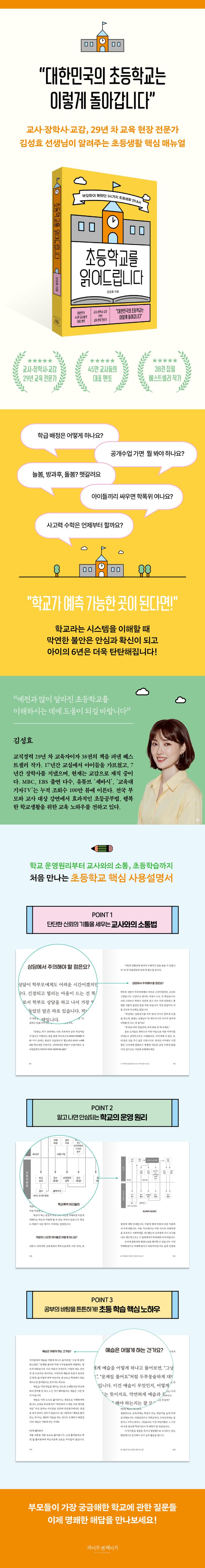 "돌봄은 어떻게 신청하나요?", "학폭위가 열리면 어떻게 되나요?", "안전사고 대응은요?" 낯선 용어와 복잡한 절차로 어렵고 막연하게 느껴졌던 학교의 운영 원리를 부모의 눈높이에서 친절하게 풀어낸다. 학급 배정의 기준부터 담임교사 부재 시 대응방안, 학폭사안 처리과정까지 학교 시스템의 정확한 기준을 알게 되면, 부모는 감정적인 대응 대신 상황을 이해하며 차분히 판단할 수 있다. 그 확신 속에서 아이의 학교생활은 더욱 단단해질 것이다.