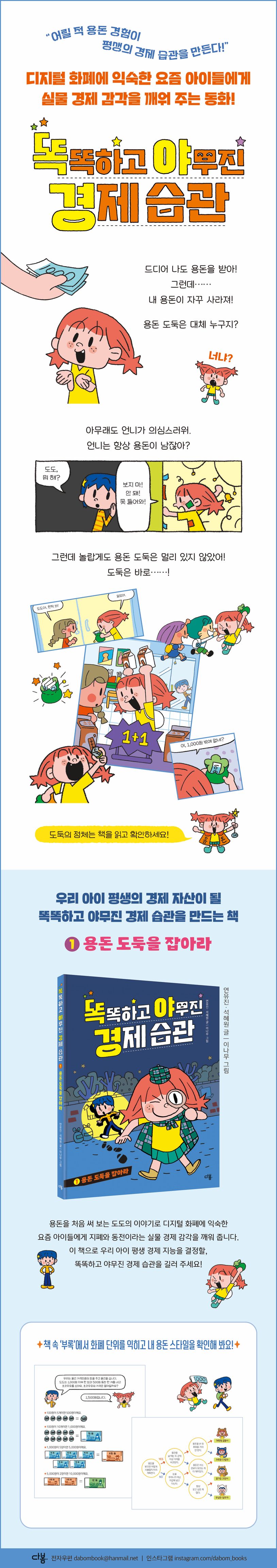 이야기가 끝난 뒤에는 독자가 바로 적용할 수 있는 부록이 알차게 담겨 있습니다. 용돈을 처음 쓰는 아이가 꼭 알아야 할 화폐 단위 설명부터 스스로 세워 보는 용돈 계획, 나만의 소비 스타일을 점검하는 설문지까지! 재미로 시작해서 실천으로 끝나는 〈똑똑하고 야무진 경제 습관〉 시리즈는 아이 경제 교육을 어디서부터 시작해야 할지 고민하는 학부모님과 선생님에게 가장 명쾌한 해답이 되어 줄 것입니다.
