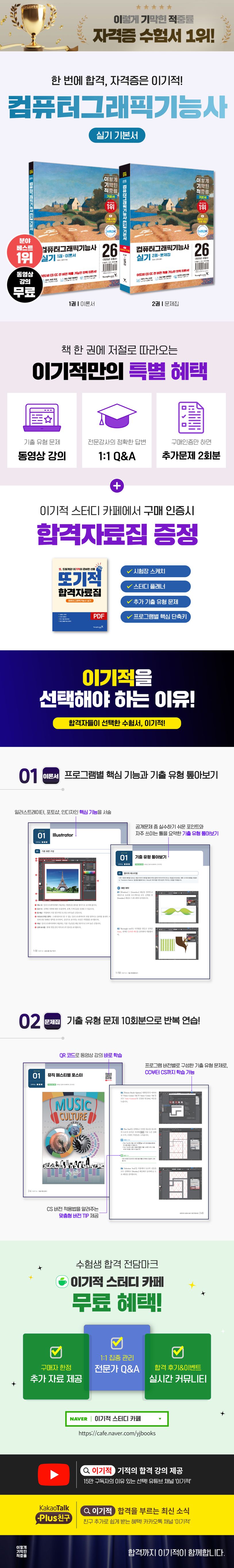 기출 유형 문제는 어도비 CS와 CC 버전별로 예제 화면과 설명을 구분해 수록하여, 사용 중인 버전과 관계없이 학습할 수 있도록 했습니다. 버전에 따라 작업 방법이 달라지는 부분은 '버전 TIP'을 통해 해결 방법을 안내했습니다. 도서 곳곳에는 '기적의 TIP'을 추가해 놓치기 쉬운 부분과 작업 시간을 단축할 수 있는 실전 노하우까지 꼼꼼히 담아냈습니다. 제공되는 실습자료를 활용하여 도서의 예제를 따라해 보세요. 10문제만으로도 실기 시험에 완벽히 대비하실 수 있습니다.
