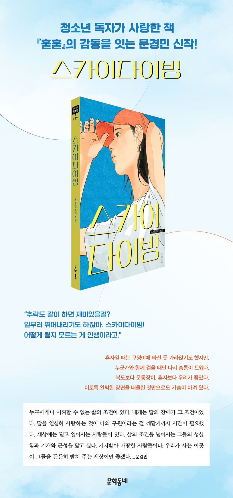 『훌훌』로 제12회 청소년문학상 대상과 제14회 권정생문학상을 수상하며 청소년 독자들의 독보적인 지지와 사랑을 받아 온 문경민 작가의 신작. 『훌훌』에서 단절된 과거를 딛고 내일을 향해 나아가는 청소년의 성장을 보여 주고, 『나는 복어』를 통해 자신만의 꿈을 찾아 나서는 특성화고등학교 아이들의 생생한 일상을 그렸던 문경민 작가가 이번에는 『스카이다이빙』으로 먹먹한 감동을 전한다. 삶의 중력을 이겨내고 최선을 다해 좋은 쪽으로 내딛는 용기를 보여 주는 인물들로 다시 한번 청소년들에게 다가간다.