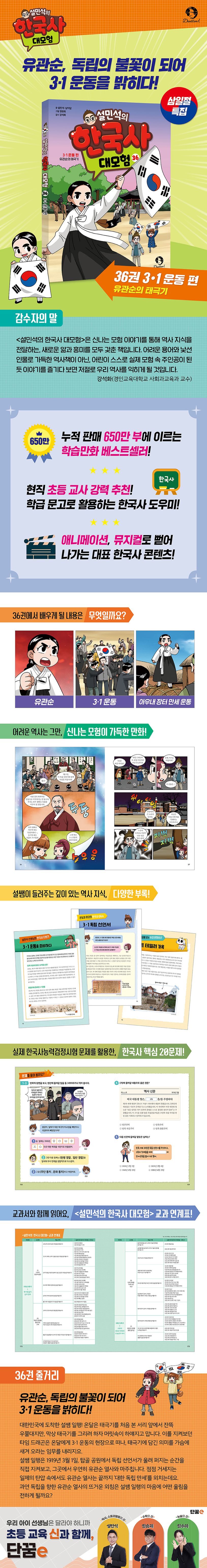 『설민석의 한국사 대모험』 36권은 3·1 운동의 현장에서 뜨겁게 독립을 외쳤던 유관순 열사의 이야기를 담고 있습니다. 일제의 탄압과 감시를 피해 한마음으로 3·1 운동을 준비했던 민중들, 그리고 열여덟 살의 나이로 아우내 장터의 만세 물결을 이끌었던 유관순 열사의 역사까지! 일제에 맞서 싸운 3·1 운동의 의미와 그날의 감동을 더욱 생생하게 만나 보세요.
