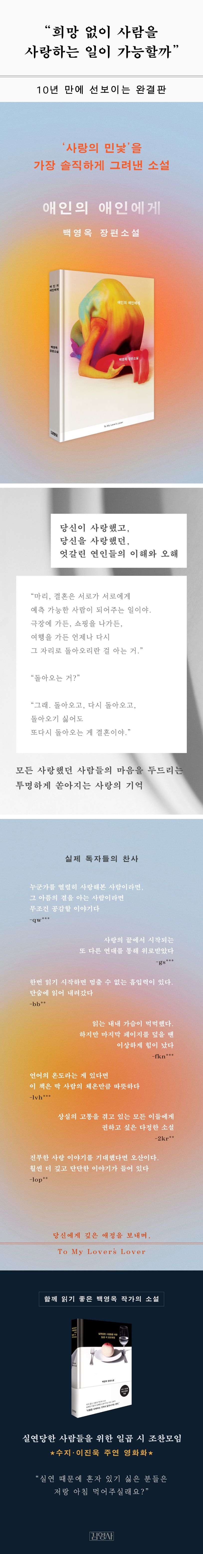 섬세한 문체와 독보적인 감수성으로 사랑받는 작가 백영옥의 대표작 《애인의 애인에게》가 김영사에서 10년 만에 완결판으로 출간되었다. 2016년 초판 이후 문장을 다듬고 깊이를 더해 다시 선보이는 이번 완결판은, 사랑의 시작과 끝을 넘어 그 이후의 감정까지 깊이 있게 담아낸다. 《실연당한 사람들을 위한 일곱 시 조찬모임》을 통해 사랑 이후의 상실을 애틋하게 그려내며 많은 공감을 받았던 작가는, 이번 작품에서 통제 불가능한 사랑의 민낯을 가장 솔직한 언어로 마주한다.