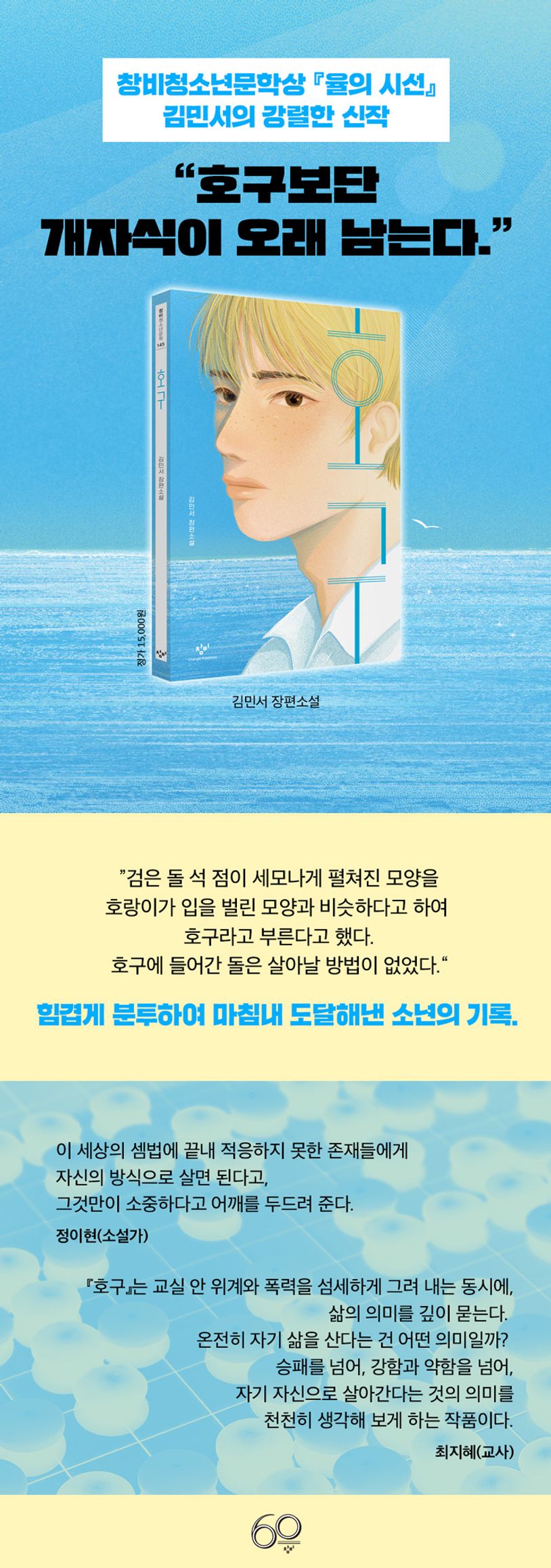 『율의 시선』으로 제17회 창비청소년문학상을 수상하며 독자들에게 큰 사랑을 받은 김민서의 신작 장편소설 『호구』(창비청소년문학 145)가 출간되었다. 『율의 시선』에서 자신만의 닫힌 세계에 타인을 받아들이며 생겨나는 균열을 섬세한 시선으로 담았던 작가는 이번 작품에서 세상과 부딪치며 위태롭게 흔들리는 소년의 성장을 강렬하게 선보인다. 착하게만 살아왔던 주인공 ‘윤수’가 강하고 나쁜 아이가 되기로 결심하면서 벌어지는 이야기로, 자신의 욕망을 치열하게 들여다보고 삶과 행복에 대한 답을 찾아가는 과정이 뜨겁게 담겼다. ‘호구(虎口)’란 본래 ‘호랑이의 입’이라는 뜻으로 바둑에서 세 돌에 둘러싸여 위태로운 상황을 이르는 말이다. ‘호구’ 속에서 살아남기 위해 자신을 벼려 낸 소년의 고민과 깨달음이 바둑 대국에 비유되며 감동적으로 펼쳐진다. 진짜 ‘나’ 그리고 진정한 행복에 도달하기 위해 최선의 수를 찾아 헤매는 모든 이들을 위한 소설이다.