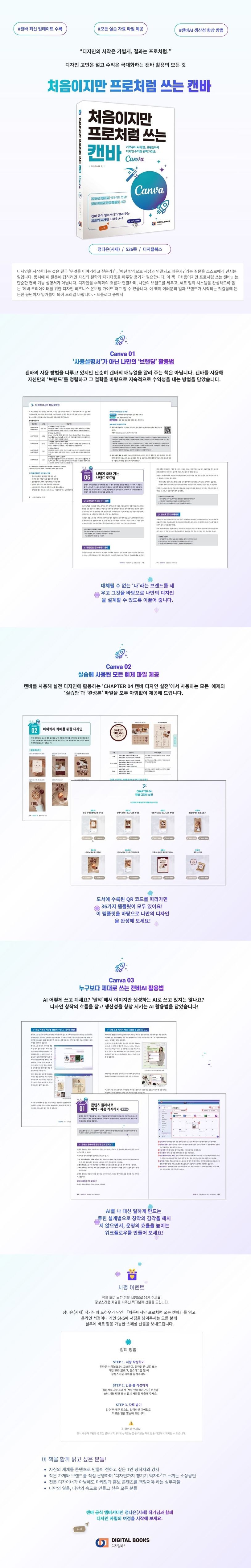 “직접 디자인을 하고 싶어도 높은 숙련도가 필요한 그래픽 프로그램을 익히기엔 시간이 없고, 복잡한 기능들 앞에서 엄두조차 내지 못하는 현실적인 벽에 부딪히기 때문이죠. 저는 그런 분들에게 망설임 없이 캔바를 추천합니다. 캔바는 복잡한 툴을 익히는 수고를 덜어 주고, ‘어떻게 만들지’라는 기술적인 고민에 에너지를 쏟는 대신, ‘나만의 세계를 어떤 방향으로 만들 것인가’라는 본질에 더 집중할 수 있기 때문입니다. 또한 캔바의 직관적이고 혁신적인 AI 기능을 활용해 전문가가 아니더라도 얼마든지 자신의 브랜드를 전략적으로 알리고 수익화의 흐름을 만들 수 있습니다.” - 머리말 중에서