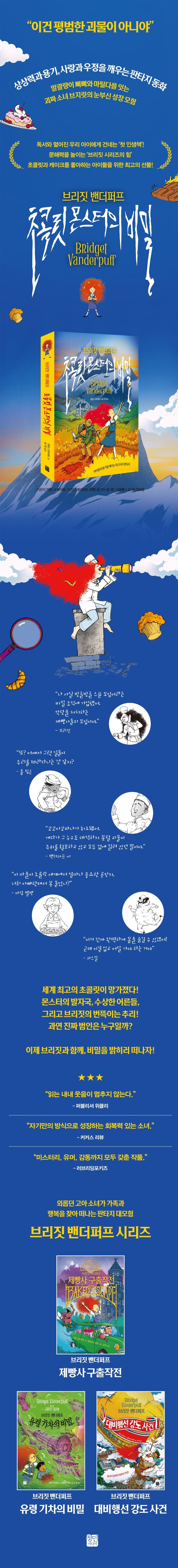 〈브리짓 밴더퍼프〉 시리즈는 출간과 동시에 영국을 비롯한 유럽·북미 아동문학 시장에서 주목받으며, 기발한 설정과 개성 강한 주인공을 앞세운 새로운 탐정 시리즈로 자리매김했다. 『초콜릿 몬스터의 비밀』은 이 시리즈의 네 번째 작품으로, 모험과 미스터리가 주는 짜릿한 쾌감이 점점 더 고조되는 동시에 주인공 소녀인 브리짓의 내면이 성장해 가는 과정과 그녀가 사랑하는 사람들을 지키기 위해 두려움에 맞서는 용기를 보여 주는 이야기다.