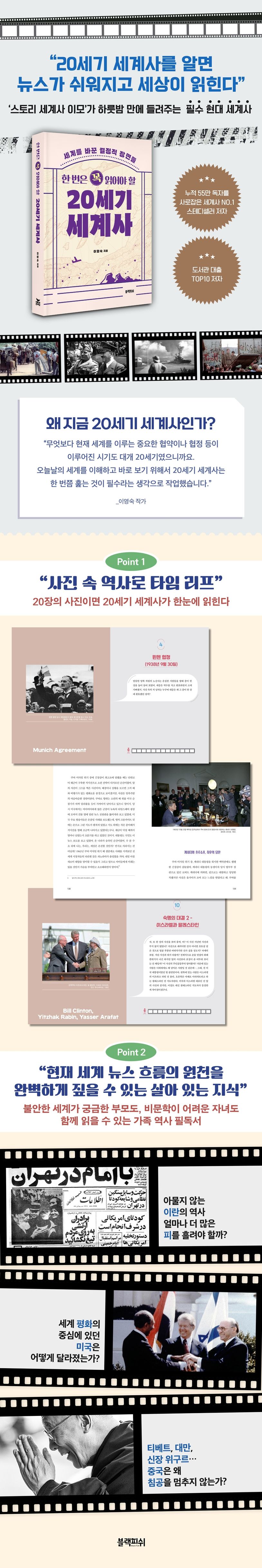 20세기 세계사 속 중요한 사건을 포착한 사진 한 장을 통해 역사를 재미있게 읽고, 복잡한 세계정세의 맥락까지 시원하게 잡는 책이다. 역사 분야 스테디셀러 《식탁 위의 세계사》, 《옷장 속의 세계사》 등 친근한 소재와 세계사를 연결한 참신한 콘셉트의 책으로 청소년뿐 아니라 학부모, 교사, 일반에까지 폭넓은 사랑을 받고 있는 이영숙 작가의 반가운 신작이다.