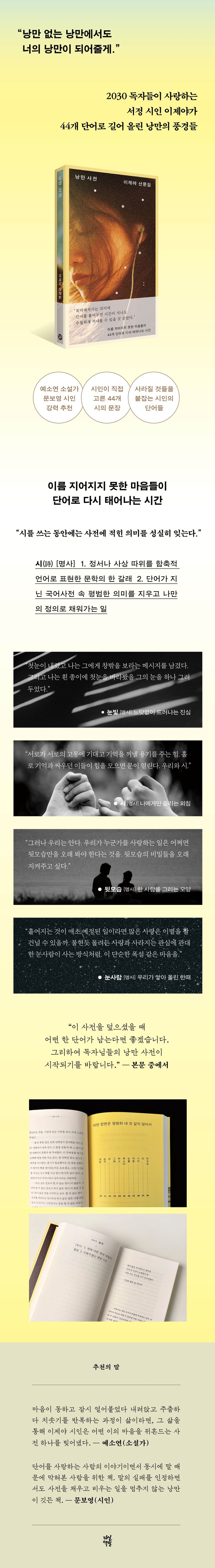 시인은 어떤 단어로 마음을 돌아보고 시를 시작할까? 서정 시인 이제야 시인의 신작 산문집 『낭만 사전』이 출간되었다. 카리나가 선물하고 박정민이 추천해 화제가 되기도 한 시집 『진심의 바깥』이후 첫 작품으로, 시인은 2030 세대의 뜨거운 사랑을 받으며 시 열풍을 일으킨 주역이기도 하다. 속도와 효율, 정답을 쫓는 시대에서 기꺼이 헤매고 흔들리며 삶의 모든 과정을 소중히 여기는 ‘낭만’의 가치가 더욱 주목받고 있다. 이제야 시인은 쉬이 설명되지 않은 것들을 바라보고 질문하며 그 과정을 활자로 기록하는 사람으로서 우리가 그리워하는 낭만을 가장 시답게 풀어낸다.