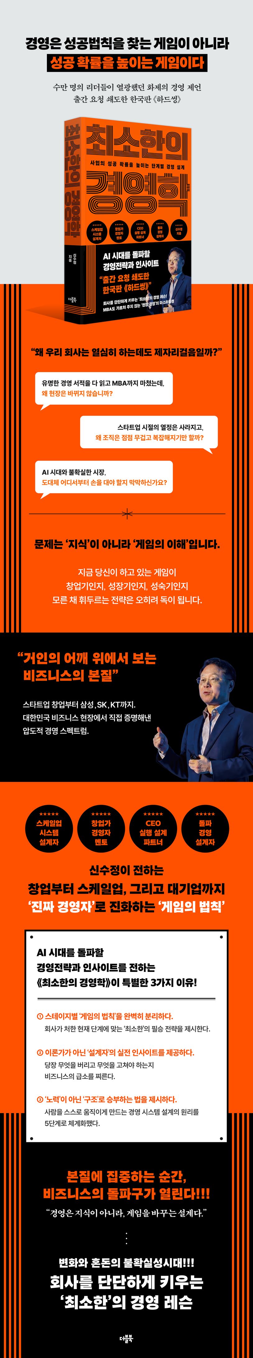 디지털 전환과 AI의 확산, 지정학적 리스크와 자본시장 변동성까지 겹치며 그 어느 때보다 불확실한 경영 환경에 놓여 있다. 이처럼 국면이 수시로 바뀌는 시대에는 과거의 성공공식이나 단편적 지식만으로는 조직을 지켜내기 어렵다. 지금 기업에 필요한 것은 더 많은 경영지식과 정보가 아니라, 변화하는 환경 속에서도 성공 확률을 높일 수 있도록 경영 시스템을 설계하는 것이다. 이러한 문제의식에서 출발한 신수정 대표는 지속 가능한 경영을 고민하는 이들에게 가장 핵심적인 경영의 원칙들을 제시하기 위해 《최소한의 경영학》을 펴냈다. 창업부터 급성장 기업, 성숙기의 대기업까지 두루 경험하며 스케일업 시스템 설계자, 창업가와 경영자 멘토, CEO 실행 설계 파트너, 돌파 경영 설계자로서 그는 복잡한 현실 속에서도 제대로 작동하는 경영의 본질을 제시한다.
