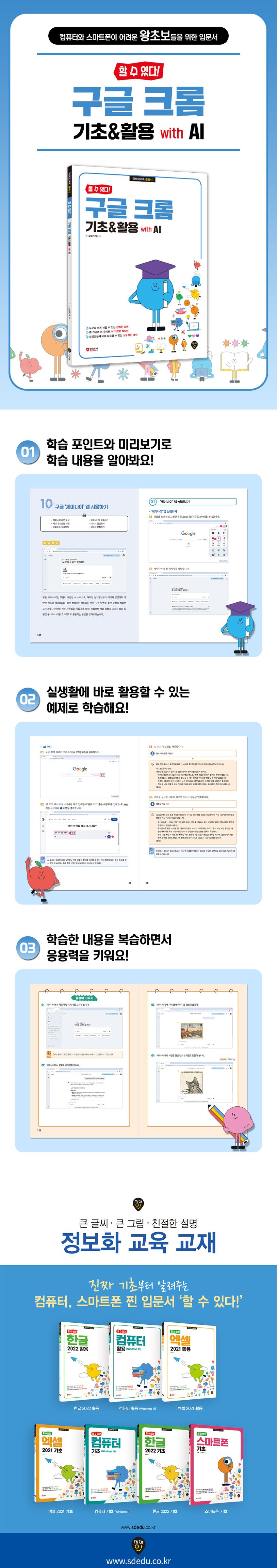 각 기능은 따라 하기 과정으로 구성되어 인터넷이 낯선 중장년층 학습자도 부담 없이 해당 기능을 익힐 수 있습니다. 또한, 각 장의 끝에 포함된 '응용력 키우기' 실습 문제로 배운 내용을 점검하고 복습할 수 있습니다.