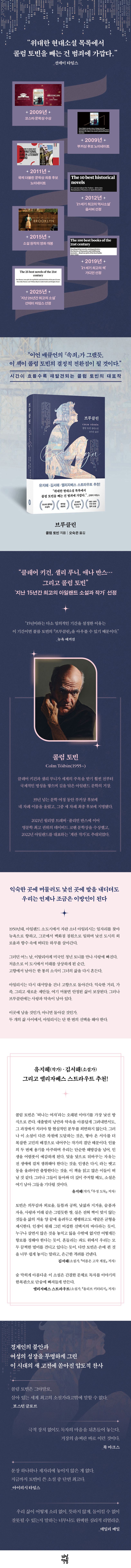 “이언 매큐언의 『속죄』가 그랬듯, 이 책이 콜럼 토빈의 결정적 전환점이 될 것이다.” 영국 펭귄 출판사의 예언은 곧 현실이 됐다. 2009년 출간한 『브루클린』은 곧바로 부커상과 국제 더블린 문학상 후보에 오르고 코스타 문학상을 석권했다. 2016년에는 동명의 영화로 각색되어 관객을 만났고, ‘21세기 최고의 책’(2019)과 ‘지난 25년간 최고의 소설’(2025)에 선정되는 등 지난 15년간 끊임없이 재발견되며 대중성과 문학성을 동시에 거머쥔 ‘모던 클래식’의 반열에 올랐다.