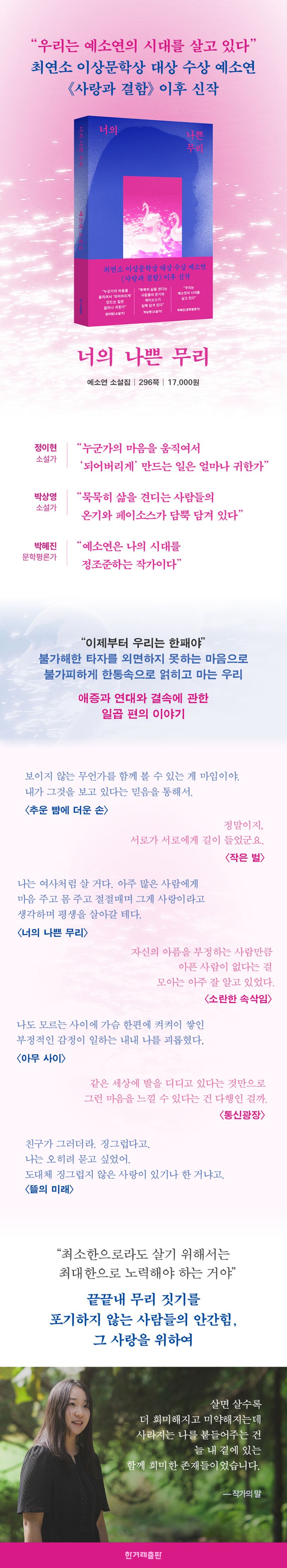이 책의 ‘발문’을 쓴 박혜진 문학평론가는 《너의 나쁜 무리》 속 인물들이 “외로움과 단절, 서로를 이해하지 못하는 도시의 삶을 극복하려는 사람들”이라 말한다. 우리가 일견 “소박해 보이기도 하고 하찮아 보일 수도 있는 그들의 시도를 지지하는 건 그들의 고통에 공감하기 때문”임을 짚어낸다. 성긴 관계와 느슨한 연결 속에서도 끊임없이 교류하며 더불어 살아가기를 선택하는 사람들. 나날이 개별화되고 결렬되는 세계에서 예소연의 인물들은 끝끝내 무리 짓기를 포기하지 않는다. 때로는 상처받고 외로이 남겨질지라도, 서로가 서로에게 닿고자 하는 안간힘을 멈추지 않으며 생의 귀중한 가치를 기어코 회복해낸다.