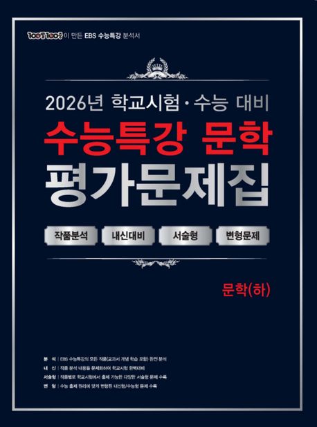 수능 국어의 연계 교재로 활용되고 있는 『EBS 수능특강 문학』에 수록된 작품을 체계적이고 완벽하게 학습하기 위한 평가문제집이다. 교과서 개념 학습에서부터 실전 학습에 이르기까지 『EBS 수능특강 문학』에 수록된 모든 작품을 자습서 이상으로 상세히 분석하였고, 내신과 수능에 꼭 나오는 출제 포인트를 단계별로 학습하도록 해 학생들이 내신과 수능 모두에 대비할 수 있도록 했다. 문학(상)은 교과서 개념 학습, 고전 시가, 현대시, 고전 산문으로 구성되었고, 문학(하)는 현대 소설, 극수필, 갈래 복합, 실전 학습으로 구성되었다.